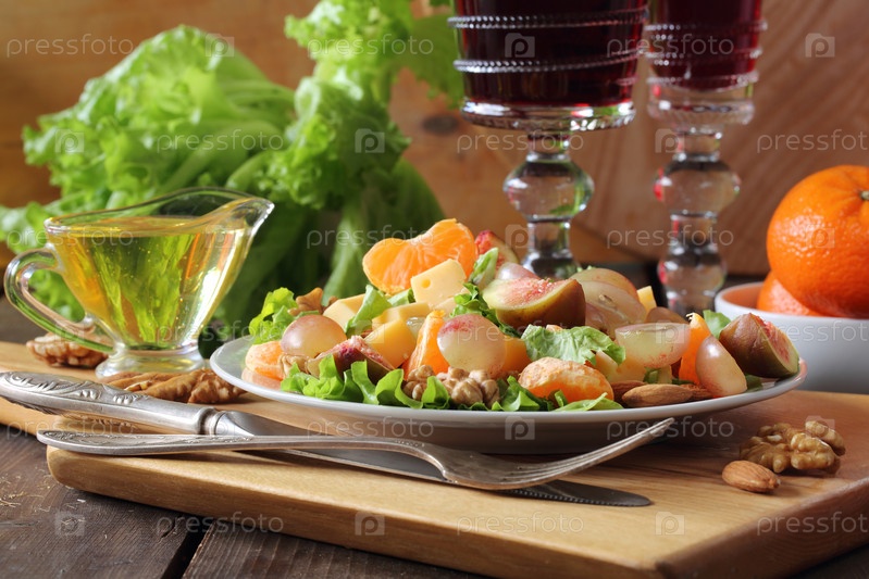 Фруктовый салат с красным вином на деревянном столе