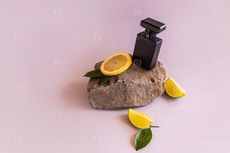 Черный матовый флакон духов или туалетной воды балансирует на сером натуральном камне и дольках цитрусовых. пастельный фон. копия пространства