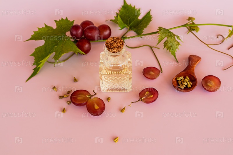 Стеклянная рельефная бутылка с пробкой с натуральным маслом виноградных косточек на фоне виноградной лозы. розовый фон. натуральный антивозрастной агент