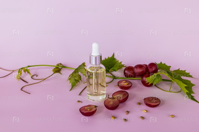 Косметический флакон из светлого стекла с пипеткой с сывороткой для ухода за кожей на основе виноградных косточек. омоложение, увлажнение. натуральная косметика