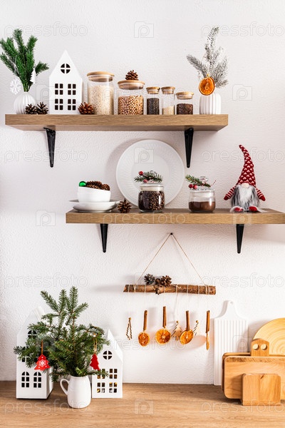 Вид спереди на открытые деревянные кухонные полки и столешницы с различной посудой и эко-украшениями на Новый год. кухня в эко стиле