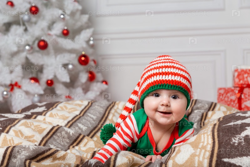 Новорожденный мальчик, одетый в костюм гнома, лежит на белом меховом ковре среди рождественских украшений