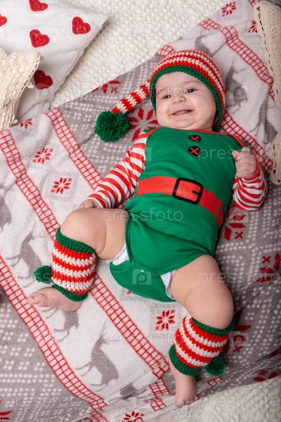 Новорожденный мальчик, одетый в костюм гнома, лежит на белом меховом ковре среди рождественских украшений. Рождественское фото младенца в чепчике с полосками. Концепция Нового года