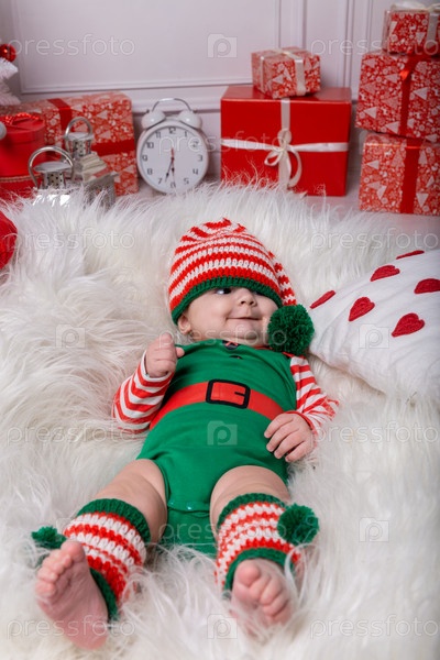 Новорожденный мальчик, одетый в костюм гнома, лежит на белом меховом ковре среди рождественских украшений. Рождественское фото младенца в чепчике с полосками. Концепция Нового года