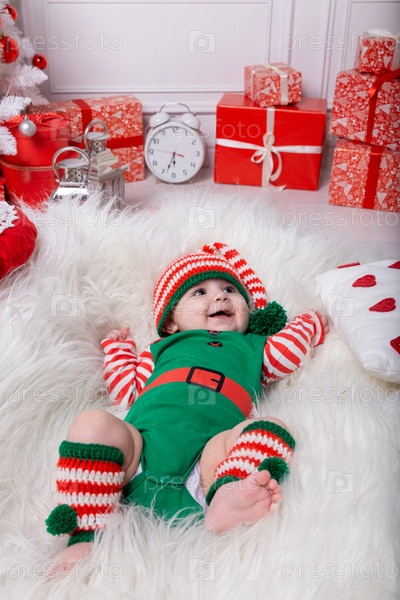 Новорожденный мальчик, одетый в костюм гнома, лежит на белом меховом ковре среди рождественских украшений. Рождественское фото младенца в чепчике с полосками. Концепция Нового года