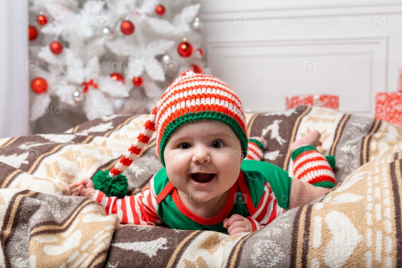 Новорожденный мальчик, одетый в костюм гнома, лежит на белом меховом ковре среди рождественских украшений