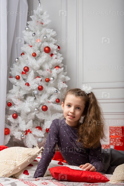Маленькая милая девушка в повседневной одежде сидит в белой комнате среди рождественских украшений. Рождественское фото ребенка в украшенной рождественской комнате. Концепция Нового года