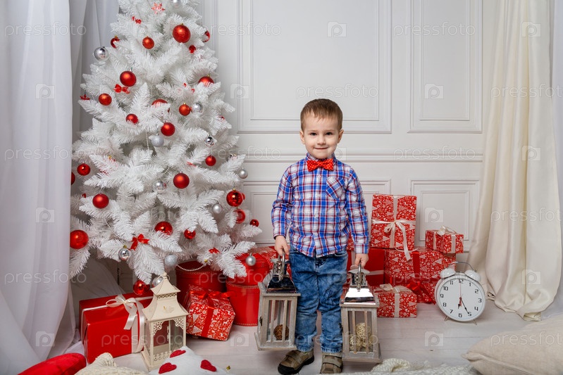 Маленький милый мальчик в повседневной одежде стоит в белой комнате среди рождественских украшений. Рождественское фото ребенка в украшенной рождественской комнате. Концепция Нового года