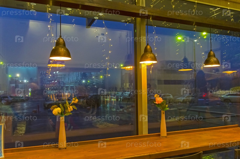 Фрагмент интерьера небольшого кафе. Вечер, искусственный свет