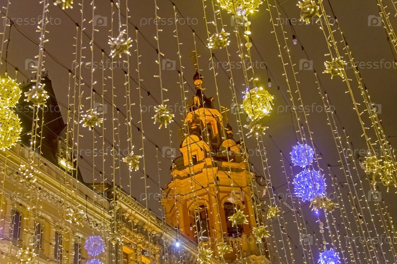 Вид на колокольню Собора Спаса Нерукотворного Образа сквозь праздничную иллюминацию. Никольская улица, Москва