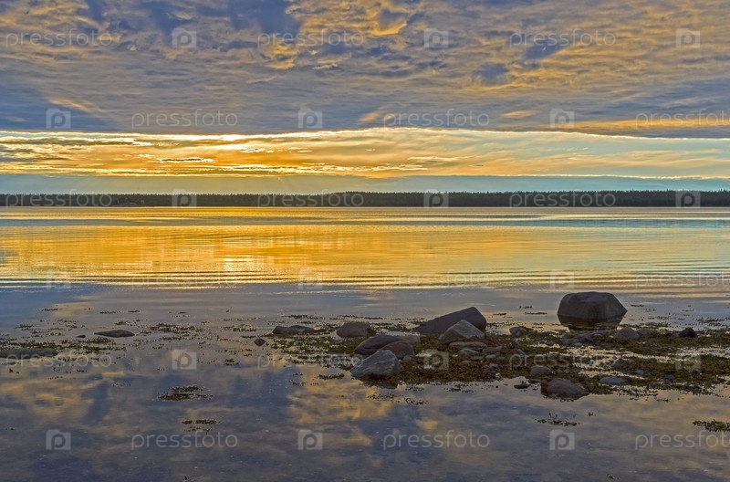 Вечер на берегу Белого моря. Солнце светит сквозь облака. Карелия, Россия, конец июня