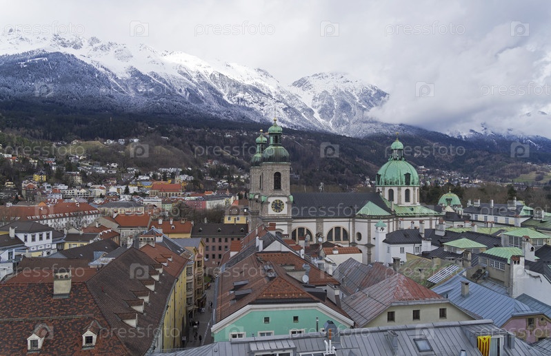 Вид с верхушки старой часовой башни на исторический центр Инсбрука и окрестные горы. Австрия