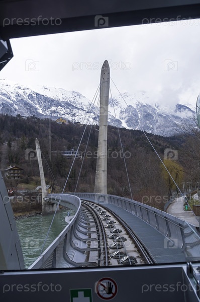 Вид из вагона фуникулера на вантовый мост через реку Инн. Инсбрук, Австрия