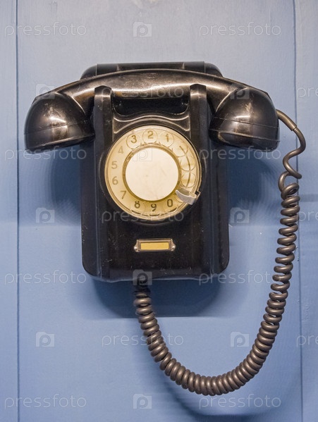 Старый дисковый телефонный аппарат висит на стене