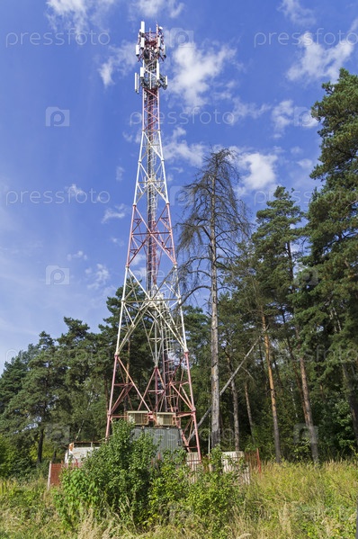 Вышка сотовой связи на лесной поляне рядом с засохшим деревом