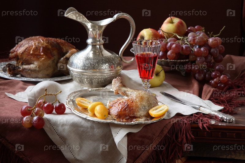 Жареная курица с красным вином и фруктами