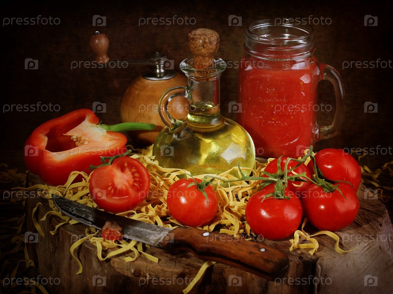 Натюрморт с макаронами, помидорами, сыром на деревянном фоне