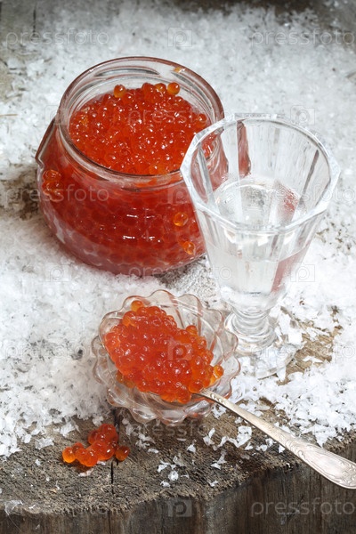 Натюрморт с красной икрой и водкой
