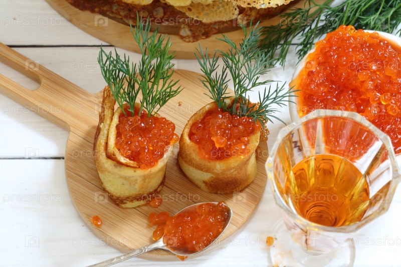 Блинчики с красной икрой и чаем. Масленица