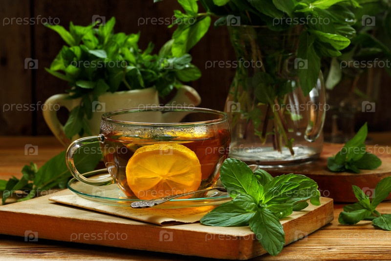 Черный чай с мятой, лимоном на деревянном фоне