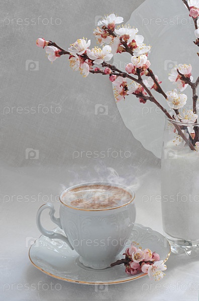 Натюрморт с кофе капучино и веткой цветущего абрикоса на белом фоне