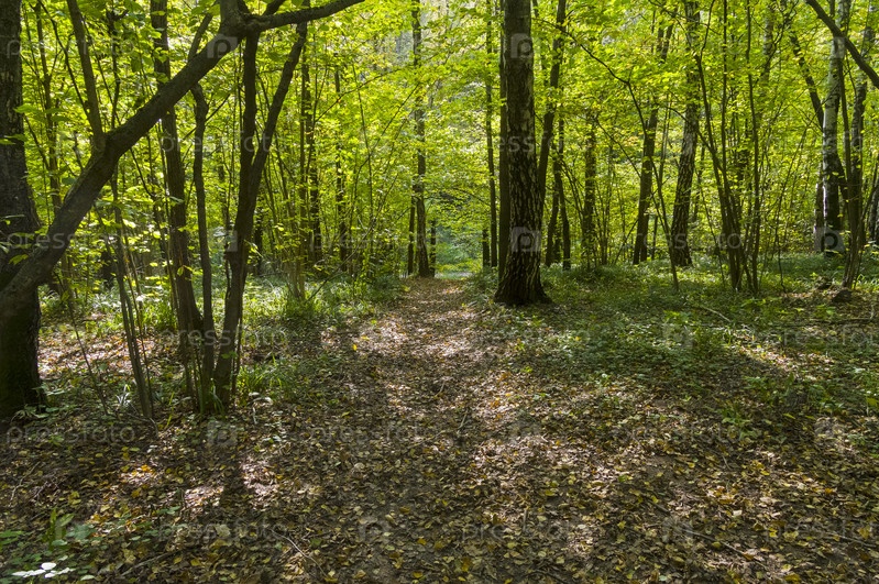 Дорожка в лесу на склоне оврага, засыпанная опавшими листьями. Солнечный день в конце сентября