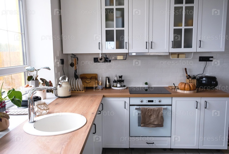 Белая уютная кухня в скандинавском стиле лофт. Домашний интерьер, дизайн столовой, духовка, плита, стол, кухонная мебель