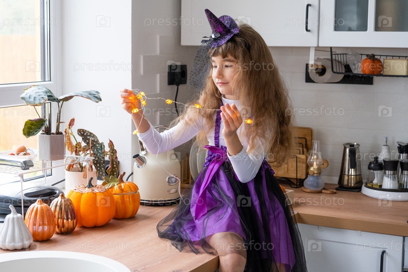 Ребенок украшает кухню дома на Хэллоуин. Девушка в костюме ведьмы играет с праздничным декором - летучими мышами, фонариком, тыквами. Осенний уют в доме, кухня в скандинавском стиле, лофт