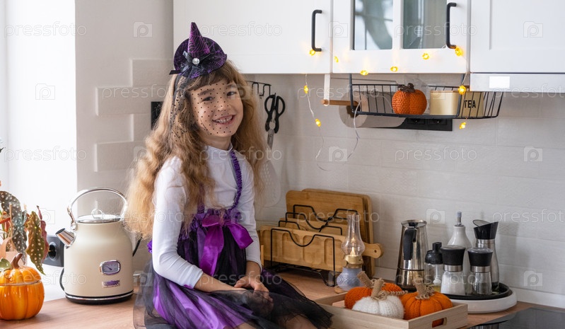 Ребенок украшает кухню дома на Хэллоуин. Девушка в костюме ведьмы играет с праздничным декором - летучими мышами, фонариком, тыквами. Осенний уют в доме, кухня в скандинавском стиле, лофт
