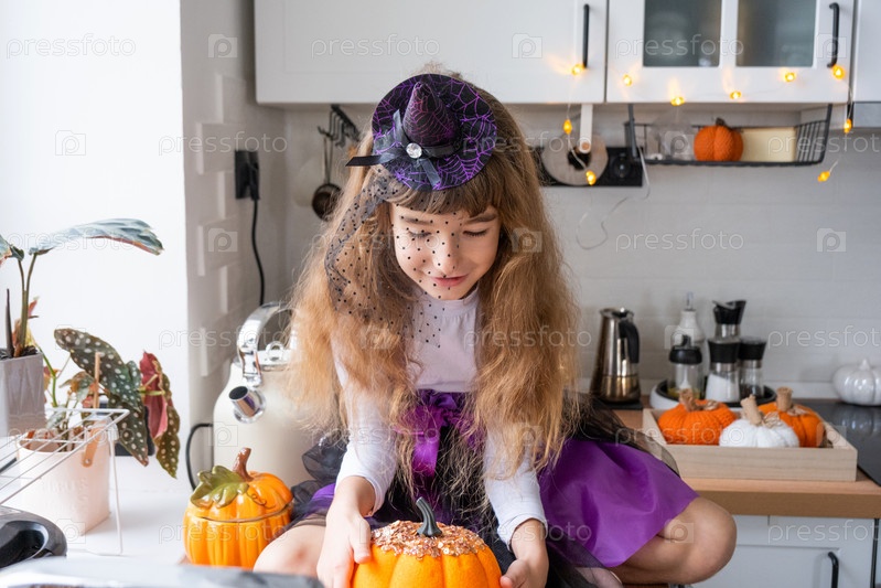 Ребенок украшает кухню дома на Хэллоуин. Девушка в костюме ведьмы играет с праздничным декором - летучими мышами, фонариком, тыквами. Осенний уют в доме, кухня в скандинавском стиле, лофт