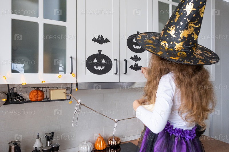 Ребенок украшает кухню дома на Хэллоуин. Девушка в костюме ведьмы играет с праздничным декором - летучими мышами, фонариком, тыквами. Осенний уют в доме, кухня в скандинавском стиле, лофт