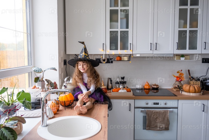Ребенок украшает кухню дома на Хэллоуин. Девушка в костюме ведьмы играет с праздничным декором - летучими мышами, фонариком, тыквами. Осенний уют в доме, кухня в скандинавском стиле, лофт