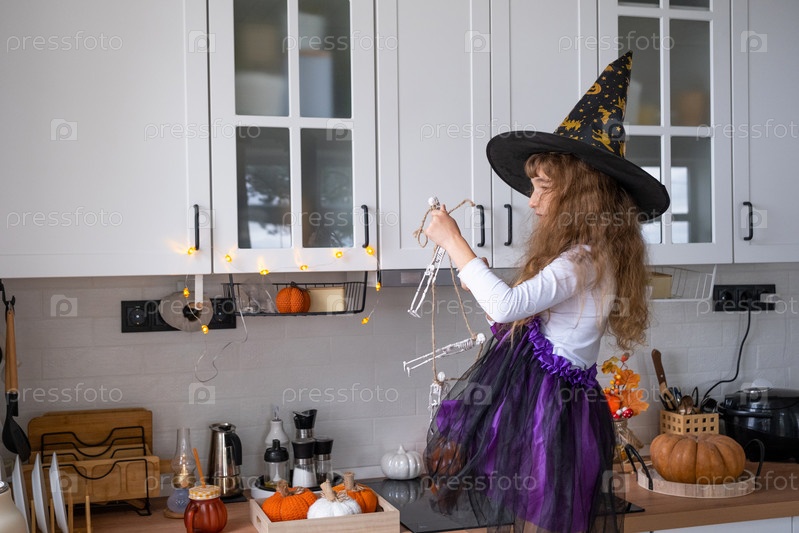 Ребенок украшает кухню дома на Хэллоуин. Девушка в костюме ведьмы играет с праздничным декором - летучими мышами, фонариком, тыквами. Осенний уют в доме, кухня в скандинавском стиле, лофт
