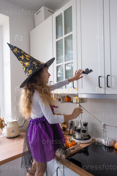 Ребенок украшает кухню дома на Хэллоуин. Девушка в костюме ведьмы играет с праздничным декором - летучими мышами, фонариком, тыквами. Осенний уют в доме, кухня в скандинавском стиле, лофт