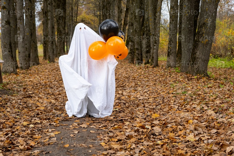 Ребенок в простынях с вырезами для глаз, как костюм привидения в осеннем лесу, пугает и ужасает. Добрый маленький забавный призрак. Хэллоуин вечеринка