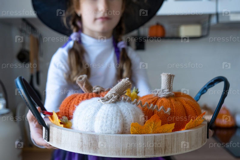 Ребенок украшает кухню дома на Хэллоуин. Девушка в костюме ведьмы играет с праздничным декором - летучими мышами, фонариком, тыквами. Осенний уют в доме, кухня в скандинавском стиле, лофт