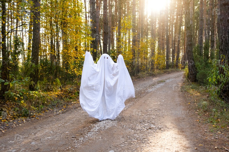 Ребенок в простынях с вырезами для глаз, как костюм привидения в осеннем лесу, пугает и ужасает. Добрый маленький забавный призрак. Хэллоуин вечеринка