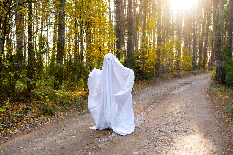 Ребенок в простынях с вырезами для глаз, как костюм привидения в осеннем лесу, пугает и ужасает. Добрый маленький забавный призрак. Хэллоуин вечеринка