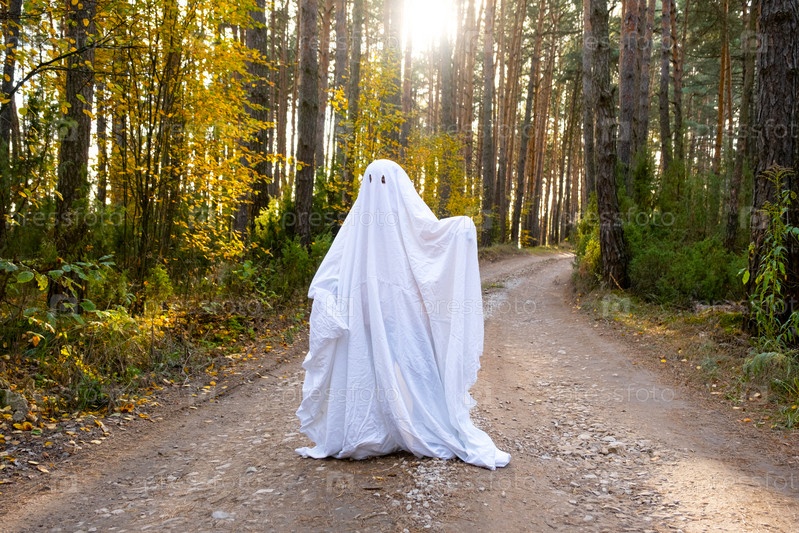 Ребенок в простынях с вырезами для глаз, как костюм привидения в осеннем лесу, пугает и ужасает. Добрый маленький забавный призрак. Хэллоуин вечеринка