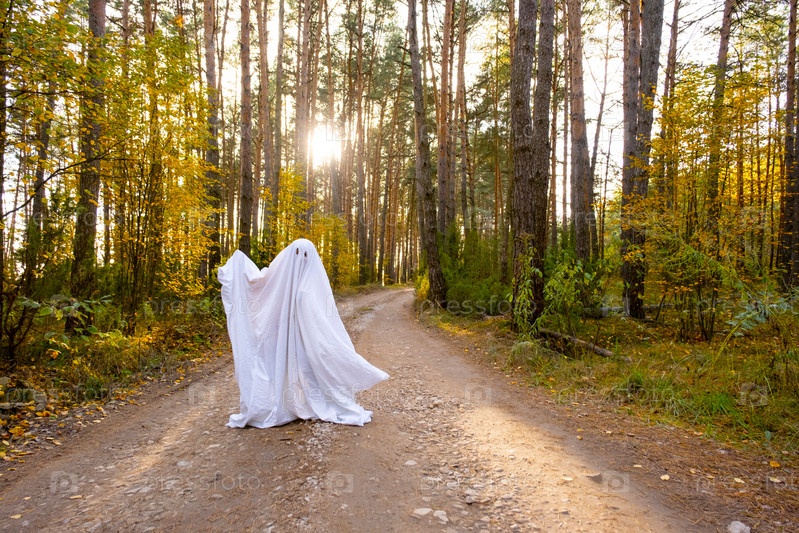 Ребенок в простынях с вырезами для глаз, как костюм привидения в осеннем лесу, пугает и ужасает. Добрый маленький забавный призрак. Хэллоуин вечеринка