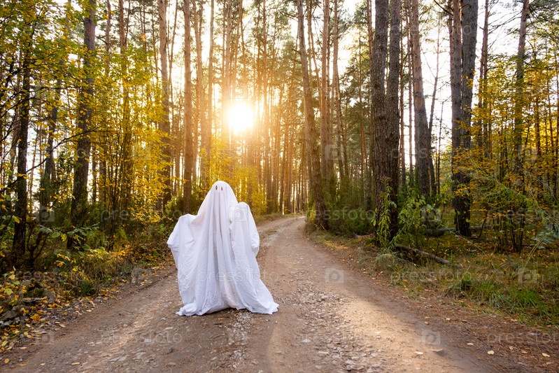 Ребенок в простынях с вырезами для глаз, как костюм привидения в осеннем лесу, пугает и ужасает. Добрый маленький забавный призрак. Хэллоуин вечеринка
