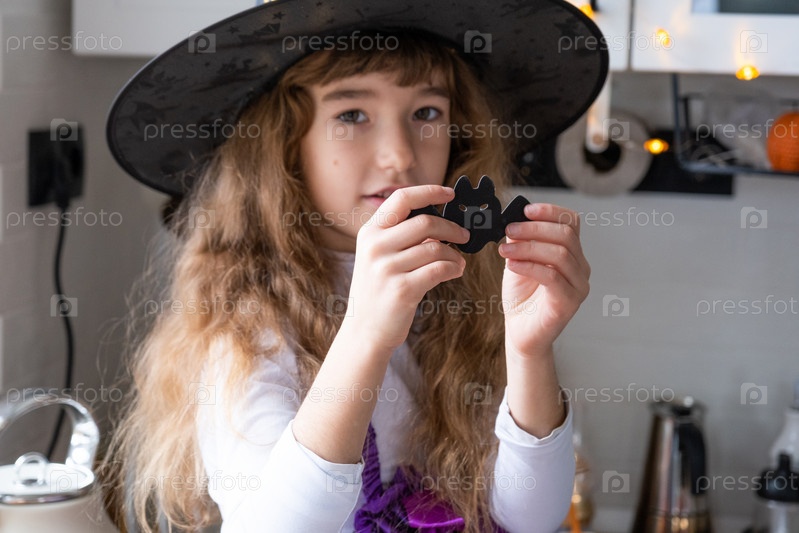 Ребенок украшает кухню дома на Хэллоуин. Девушка в костюме ведьмы играет с праздничным декором - летучими мышами, фонариком, тыквами. Осенний уют в доме, кухня в скандинавском стиле, лофт
