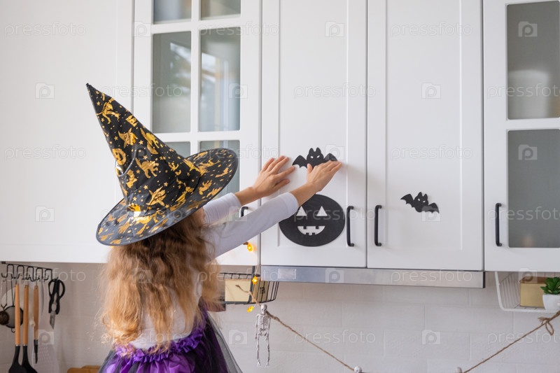 Ребенок украшает кухню дома на Хэллоуин. Девушка в костюме ведьмы играет с праздничным декором - летучими мышами, фонариком, тыквами. Осенний уют в доме, кухня в скандинавском стиле, лофт