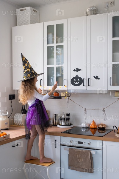 Ребенок украшает кухню дома на Хэллоуин. Девушка в костюме ведьмы играет с праздничным декором - летучими мышами, фонариком, тыквами. Осенний уют в доме, кухня в скандинавском стиле, лофт