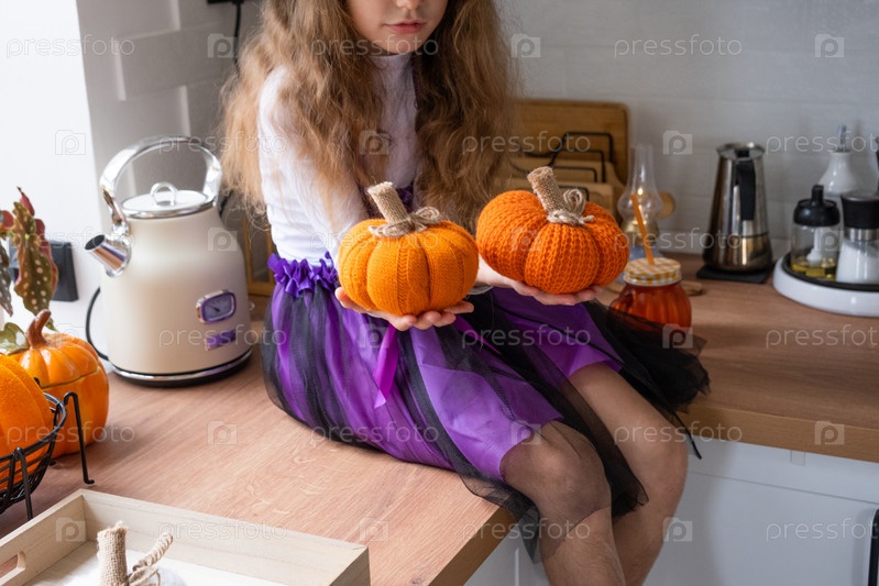 Ребенок украшает кухню дома на Хэллоуин. Девушка в костюме ведьмы играет с праздничным декором - летучими мышами, фонариком, тыквами. Осенний уют в доме, кухня в скандинавском стиле, лофт