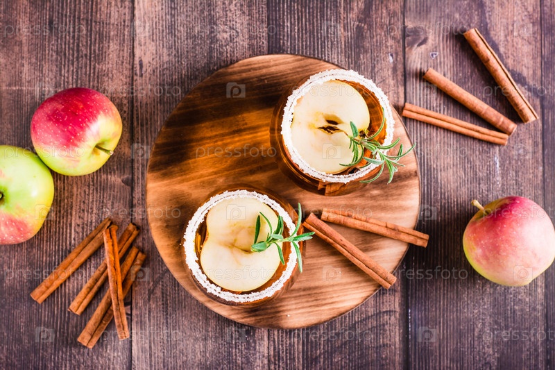 Натуральный яблочный сидр с корицей в стаканах на столе. Домашние напитки. Вид сверху