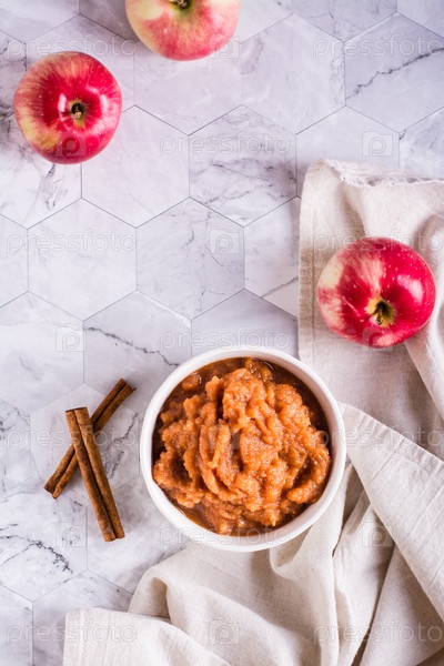 Домашнее яблочное пюре в миске и свежие фрукты на столе. Органическая еда. Верхний и вертикальный вид