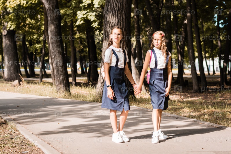 Две ученицы начальной школы улыбаются, держатся за руки и идут в школу теплым днем