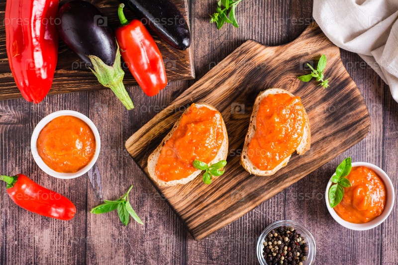 Айвар вкусная закуска из перца, баклажанов и чеснока на хлебе и в тарелках. Вид сверху