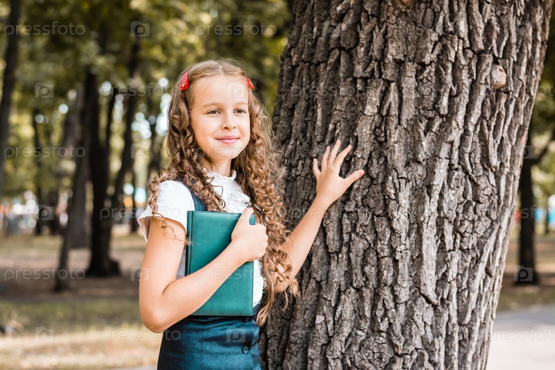 Веселая ученица в школьной форме с книгой стоит возле дерева в парке в теплый день